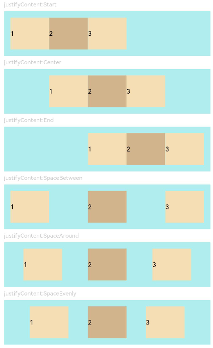 JustifyContentFlex({ justifyContent: FlexAlign.SpaceEvenly }) // 子组件在容器主轴上均分容器布局,子组件之间的距离与第一子组件到行首、最后一个子组件到行尾的距离相等