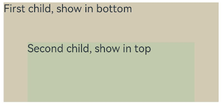 Text('First child, show in bottom').width('90%').height('100%').backgroundColor(0xd2cab3).align(Alignment.Top)