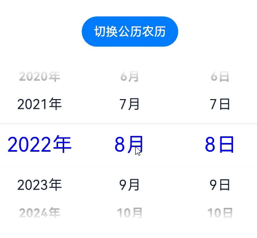 该示例实现了日期选择器组件,点击按钮可以切换公历农历。
