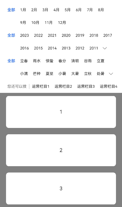 {name: '节气', options: ['全部','立春','雨水','惊蛰','春分','清明','谷雨','立夏','小满','芒种','夏至','小暑','大暑','立秋','处暑','白露','秋分','寒露','霜降','立冬','小雪','大雪','冬至','小寒','大寒']}]