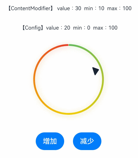 //该示例实现了Gauge组件使用Builder定制内容区,使用了环形图表组件,按钮和文本框。点击增加按钮,环形图表指针位置会向右偏移,反之点减少按钮环形图表指针位置会向左偏移。