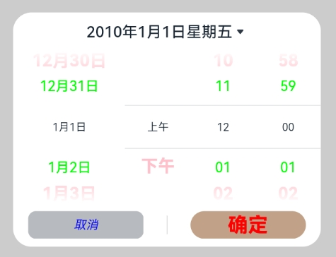 该示例通过配置disappearTextStyle、textStyle、selectedTextStyle、acceptButtonStyle、cancelButtonStyle实现了自定义文本以及按钮样式。