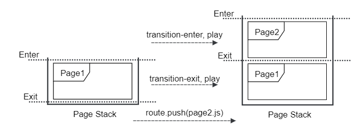 a. push场景下:进入页面栈的Page2.js应用transition-enter描述的动画配置;进入页面栈第二位置的Page1.js应用transition-exit描述的动画配置。