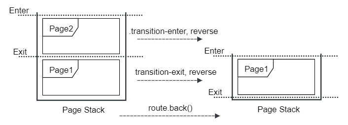 b. back场景下:退出页面栈的Page2.js应用transition-enter描述的动画配置,并进行倒播;从页面栈第二位置进入栈顶位置的Page1.js应用transition-exit描述的动画配置,并进行倒播。