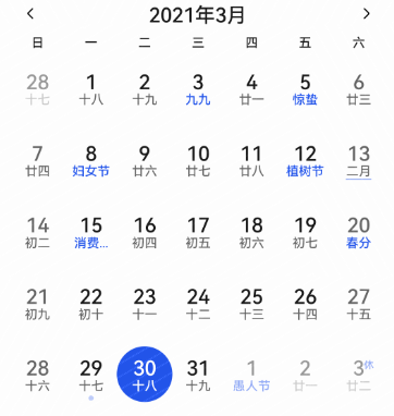 | markLunarDay | bool | 表示节假日,农历数据会变成蓝色。 |