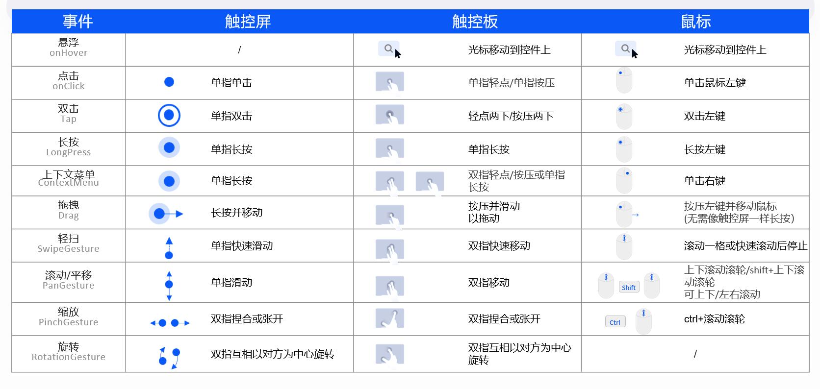 一个完整的拖拽事件,包含多个拖拽子事件,如下表所示(请访问拖拽事件了解详细用法)。当前触控屏和鼠标的拖拽事件已经实现”交互归一”,对手写笔的支持正在开发中。