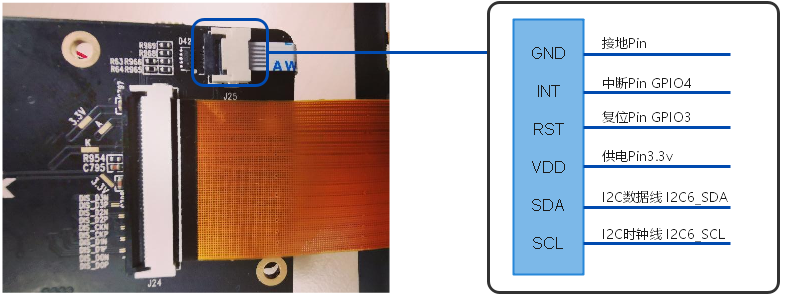 Hi3516DV300开发板套件所提供的触摸屏器件IC为GT911,该器件采用标准I2C与主机通信,通过6pin软排线与主板连接。6pin分布以及实物连接图如下图所示: