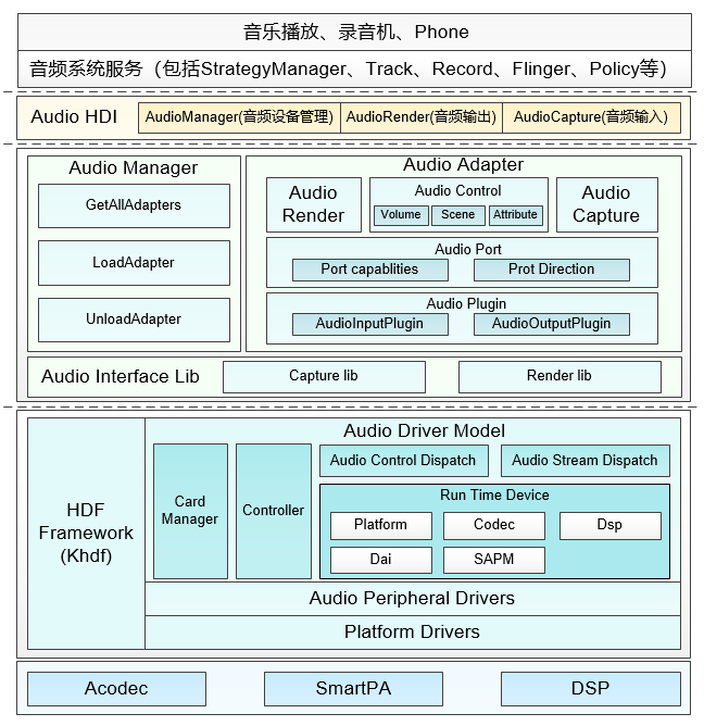Audio驱动框架基于HDF驱动框架实现。Audio驱动架构组成:
