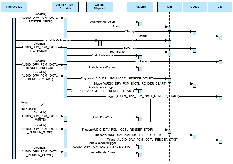 播放音频时,Interface Lib层通过播放流服务下发Render Open指令,Audio Stream Dispatch服务收到指令后分别调用各模块的函数接口对指令进行下发。
