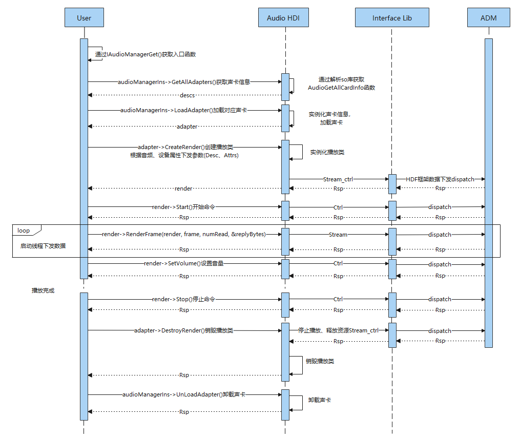 播放业务完成后,下发停止命令render->Stop()、销毁播放类adapter->DestroyRender()、卸载声卡audioManagerIns->UnloadAdapter()。