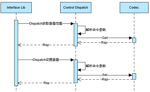 - 设置音量,首先Interface Lib层通过控制服务下发获取音量范围指令,Control Dispatch控制服务收到指令后进行解析,并调用Codec模块Get函数,获取可设置音量的范围。