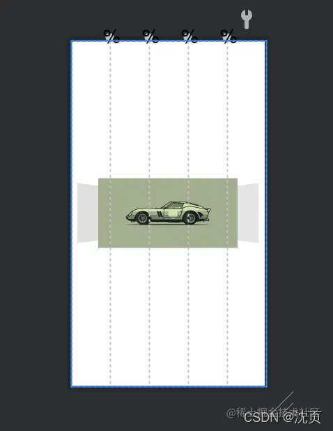 iv1在最里面,位置上下居中,左边在0.2的分割线,右边在0.8的分割线,Saturation为0,即图片黑白,translationZ为 0dp。iv2在最左边,位置上下居中,左边在父布局左侧,右边在0.4的分割线,Saturation为0,translationZ为 4dp,rotationY偏移30度。iv3在最右边,位置上下居中,左边在0.6的分割线,右边与父布局右边对齐,Saturation为0,translationZ为 6dp,rotationY偏移-30度。iv3在最上边,位置上下居中,左边在0.2的分割线,右边在0.8的分割线,长和宽各放大1.2倍,Saturation为1,即彩色图片,translationZ为 10dp。