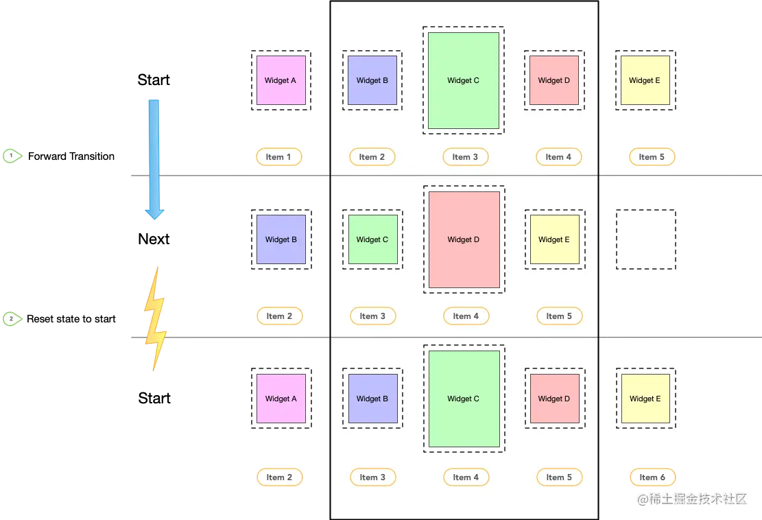 就像这张图片发生的那样,界面进行过一轮 start - next 动画以后,界面又重置为 start 状态。注意一下,虽然状态重置了,但是数据和控件的对应的关系发生了变化!