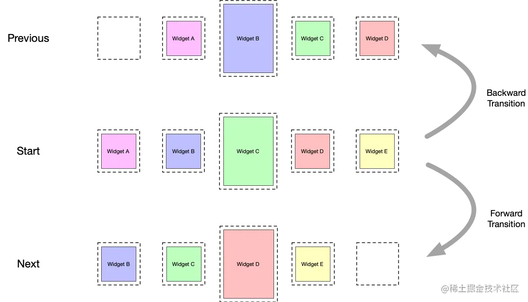 start 是组件最初的状态,start - previous 代表向前滑动的过程,start - next 则代表向后滑动的过程,对应额状态如图: