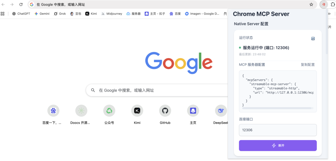 当Chrome扩展程序连接成功后,MCP服务会在本地启动HTTP服务器(默认端口12306):