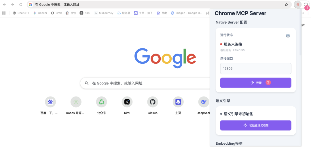 - 点击扩展程序图标,然后点击"连接"按钮启动MCP服务