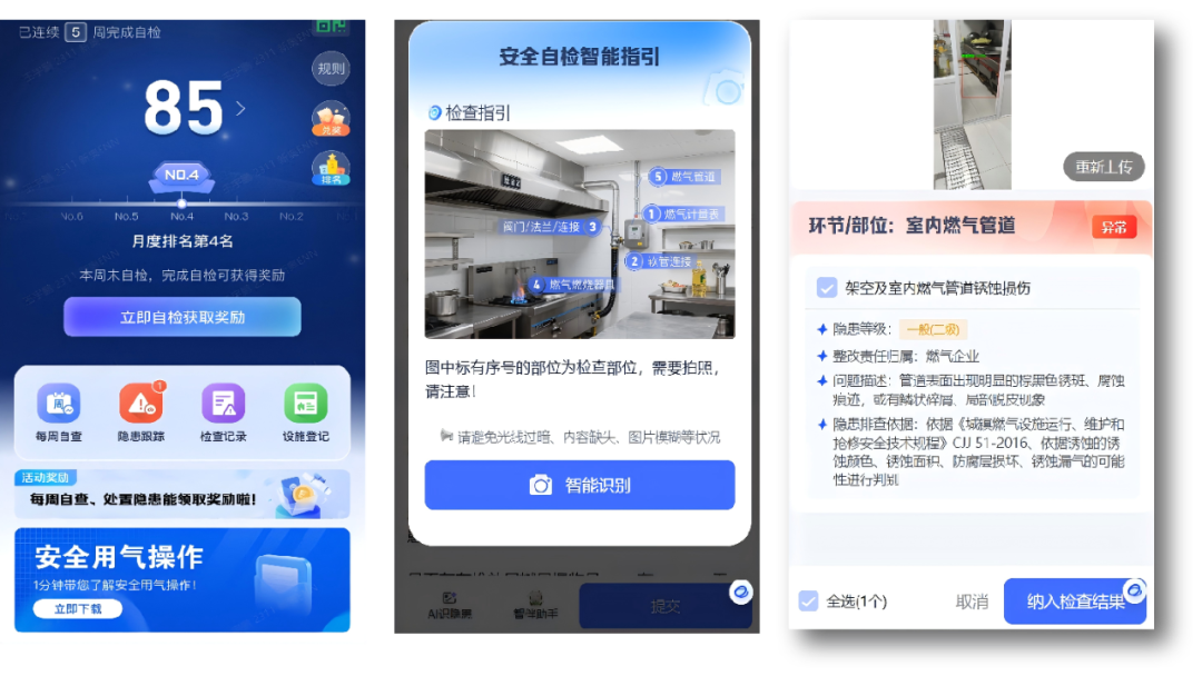 而在商户端,简单的扫码自查流程配合AI拍摄指引与自动隐患识别,极大降低了商户的参与门槛,使其从被动的管理对象转变为主动的风险防范者,有效激活了用户端的自查动力,形成“要我安全”到“我要安全”的行动转变。