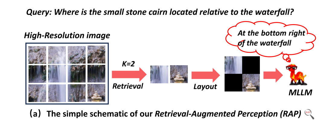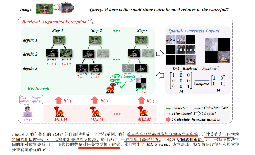 看一个工作《Retrieval-augmented perception: High-resolution image perception meets visual rag》(https://arxiv.org/pdf/2503.01222,https://github.com/DreamMr/RAP),其核心思路在于通过 VisRAG 检索与查询相关的图像块,并利用Spatial-Awareness Layout保留图像块的相对空间关系,同时借助Retrieved-Exploration Search(RE-Search),基于模型置信度和检索分数动态选择最优图像块数量。