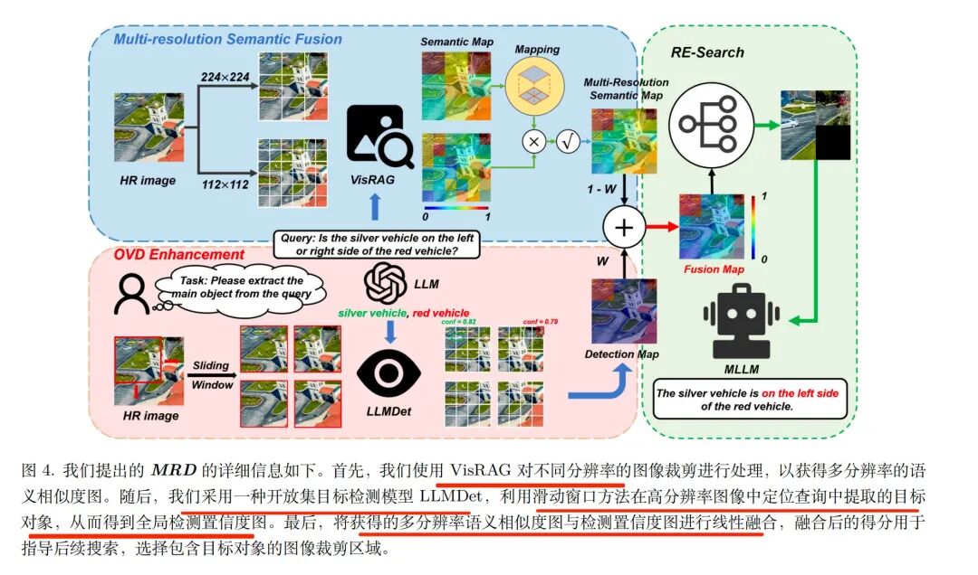 看工作:《MRD: Multi-resolution Retrieval-Detection Fusion for High-Resolution Image Understanding》,https://arxiv.org/pdf/2512.02906,思路是通过多分辨率语义融合整合不同分辨率下的语义相似性图,修正单分辨率分割带来的语义偏差并保留目标完整性,同时引入开放词汇目标检测(OVD)模型(基于滑动窗口遍历全图)生成检测置信图;最终将两种图线性融合。