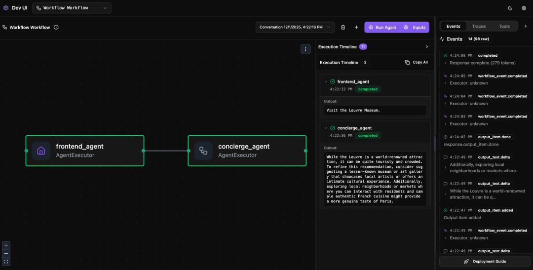 这是本文的重头戏。过去,我们调试 Agent 只能靠 print() 和无休止的控制台日志“猜问题”;而现在,我们有了 DevUI。