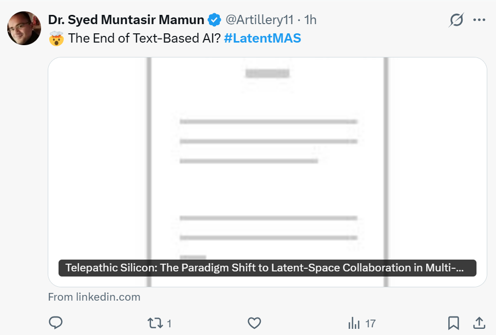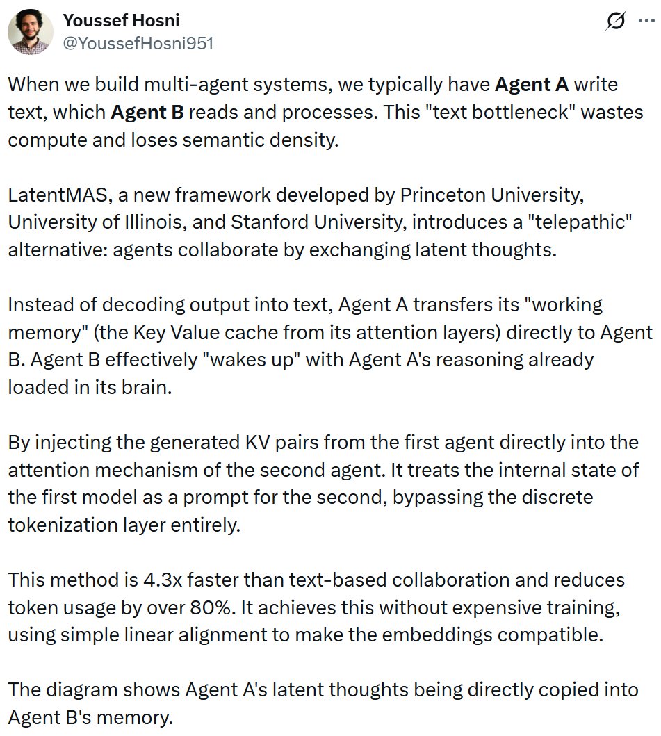 「在传统的多智能体系统中,我们通常让智能体 A 生成文本,再由智能体 B 读取并处理。这种文本瓶颈既浪费算力,又严重稀释语义信息。LatentMAS 带来了一种近乎心灵感应式的替代方案:智能体通过交换潜在思维来协作。