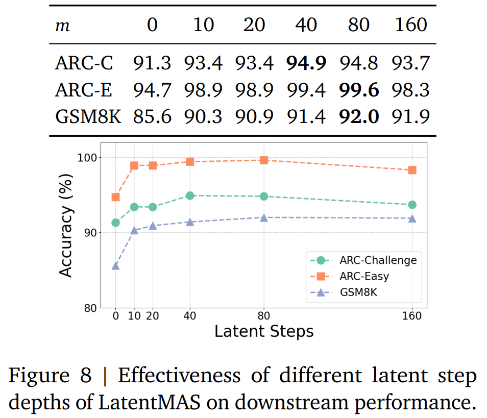 为了确定 LatentMAS 的最佳 latent step 数量,本文在三个下游任务中逐步增加 latent step ,以观察深度影响。如图 8 所示,随着 latent steps 增加,下游性能普遍提升,说明额外的潜在思维提高了 AI 协作表达能力。