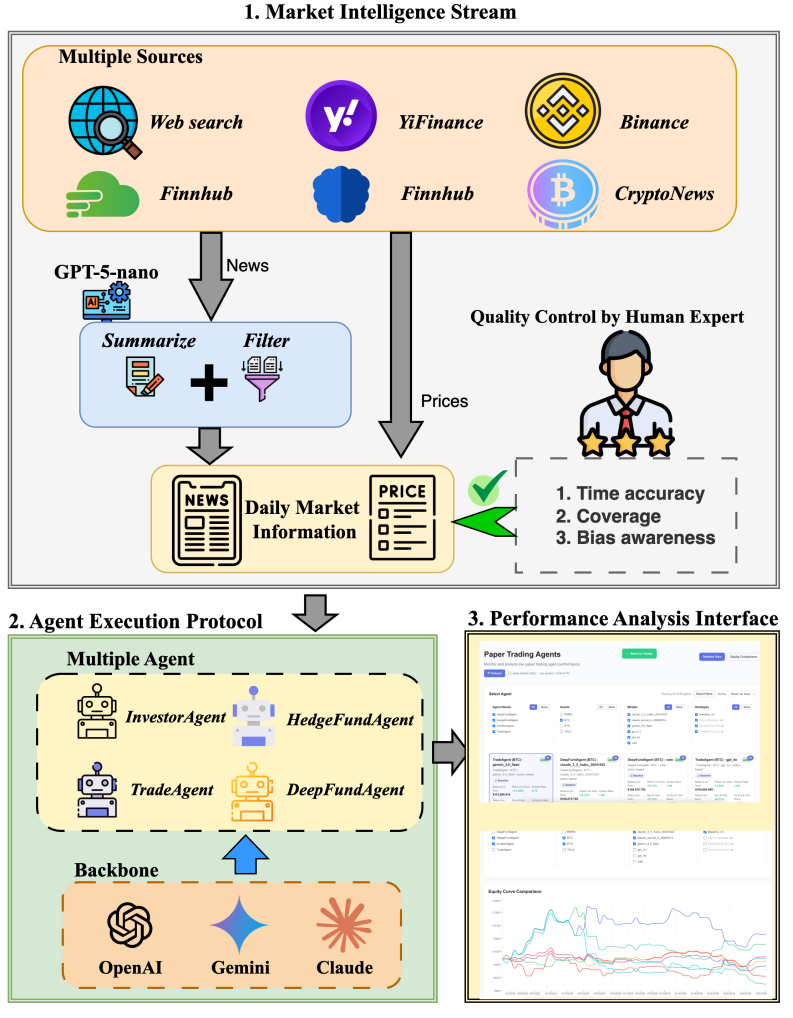 数据采集:整合多源实时数据(OpenAI Web Search、Finnhub、NewsData、yfinance、CryptoNews、Binance等),覆盖API价格数据、新闻(传统金融媒体+社交媒体),确保市场信息的全面性与实时性;