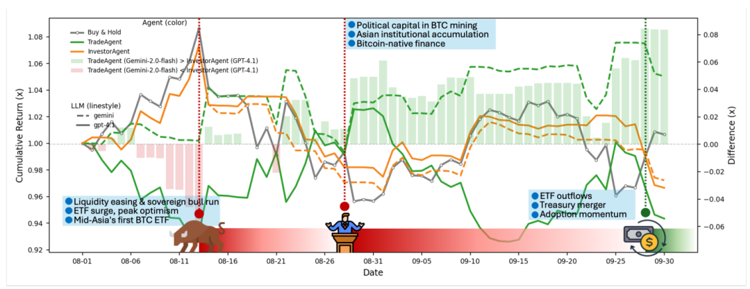 案例分析(BTC):8月13日全球股市同步上涨,TradeAgent识别极端乐观的脆弱性,在峰值对冲,正确预判价格回调;8月28日BTC出现政治资本上市、亚洲机构增持等长期利好,但TradeAgent检测技术面短期超买,执行SELL,准确预测短期调整;9月28日ETF资金流出与流动性骤增导致多agent误判,反映突发宏观反转的应对挑战。结果显示,动态适应波动(而非仅追趋势)的agnet(如TradeAgent)表现更优。