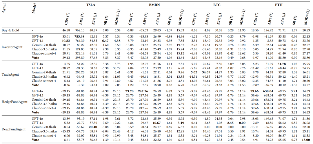 agent架构主导:固定agent、更换LLM时性能差异较小(如InvestorAgent在TSLA的累计回报跨模型波动仅±5%);固定LLM、更换agent时性能差异显著(如GPT-4.1在不同agent的累计回报跨度达-38.72%至40.83%);