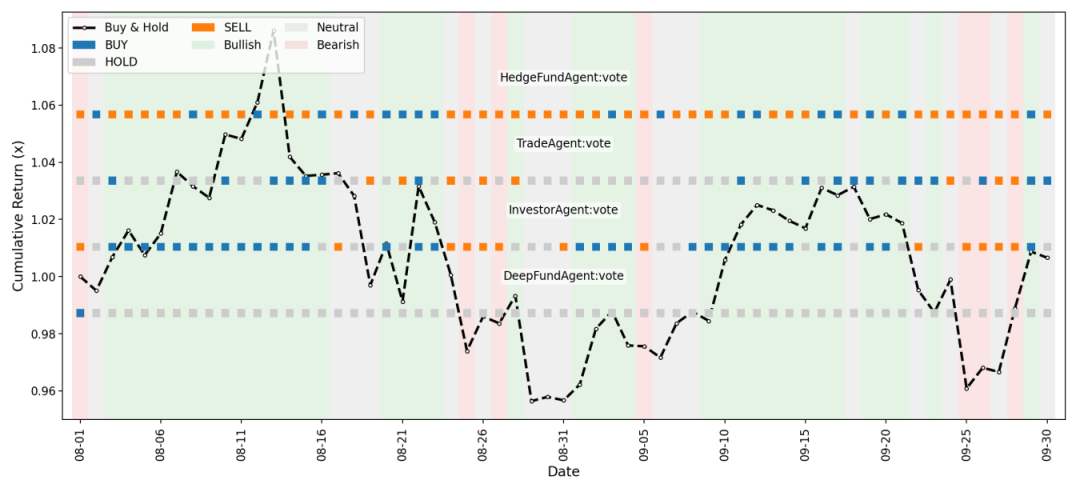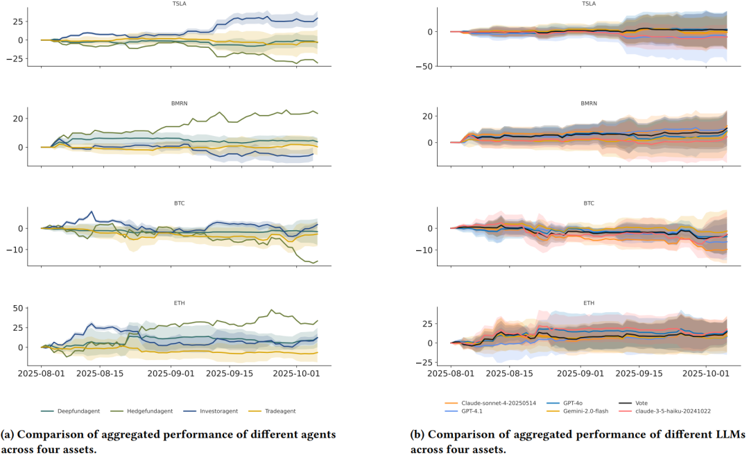 资产差异:TradeAgent与HedgeFundAgent在ETH(39.66%累计回报)等激进市场表现突出,但在TSLA等股票市场波动较大;DeepFundAgent在股票(BMRN累计回报9.45%)与加密(ETH)市场均保持稳健。