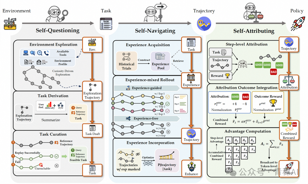 | AgentEvolver | 2025 | 通过 self-questioning、self-navigating、self-attributing 三阶段自进化机制,让 Agent 自动提出训练任务、生成经验轨迹,并形成持续的自我提升循环。 |