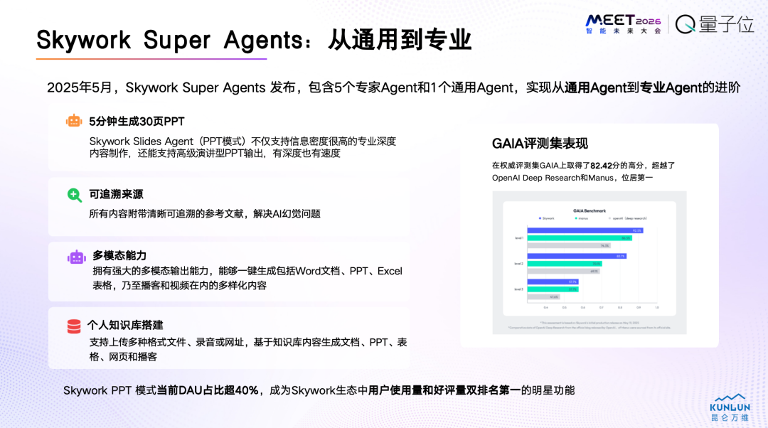 今天重点介绍的是Skywork Super Agents这个产品,是从通用到专业的Agent,包括五个专家Agent和一个通用Agent,可以在5分钟之内生成30页的PPT,我们当前的DAU占比中有40%用户在使用PPT模式,成为Skywork生态中用户使用量和好评量双排名第一的功能。