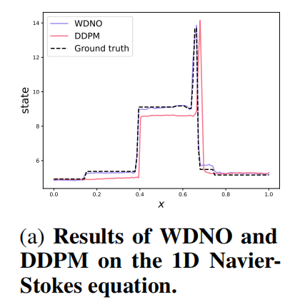 WDNO 从突变建模、分辨率泛化、控制适配三个角度提出解决方案。在突变建模上,WDNO 利用小波变换的时频局部性优势,在小波域进行扩散生成:采用双正交小波(如 bior2.4、bior1.3)对物理场数据(速度场、密度场)进行多尺度分解,得到低频近似系数(全局趋势)和高频细节系数(突变特征);针对高频系数采用更小噪声调度保留细节,低频系数采用常规扩散确保全局一致性;最后通过小波逆变换重构回原始时空域。图 7 对比了 WDNO 与 DDPM 在 1D 可压缩 Navier-Stokes 方程模拟中的表现,可见 WDNO 能精准捕捉激波等突变状态,而 DDPM 丢失较多高频细节。