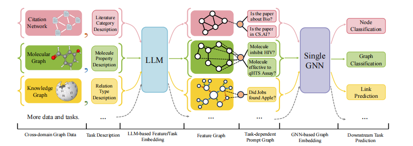 传统图神经网络(GNN)在单一场景中表现优异,但面对跨场景任务时存在明显局限。一方面,不同场景的图数据特征表示差异巨大,例如分子图节点特征多为原子属性向量,而社交网络节点特征可能是文本描述或行为序列,难以用统一方式编码;另一方面,图任务目标涵盖节点分类、链路预测、图分类等多个层级,传统 GNN 需针对不同任务设计特定结构,泛化能力不足。