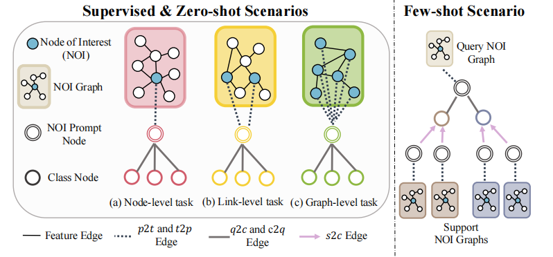 此外,OFA 通过Nodes-of-Interest(NOI)子图标准化不同任务的表示形式,图 2 展示了节点级、链路级、图级任务的 NOI 设计及提示图构建逻辑,其中蓝色节点为 NOI,双圈节点为 NOI 提示节点,灰色节点为类别节点,直观体现了不同任务的统一建模思路。