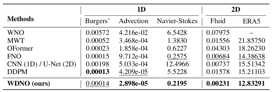 WDNO 在 5 个物理系统(1D advection、1D Burgers、1D 可压缩 Navier-Stokes、2D 不可压缩流体、ERA5 天气数据)上验证性能:
