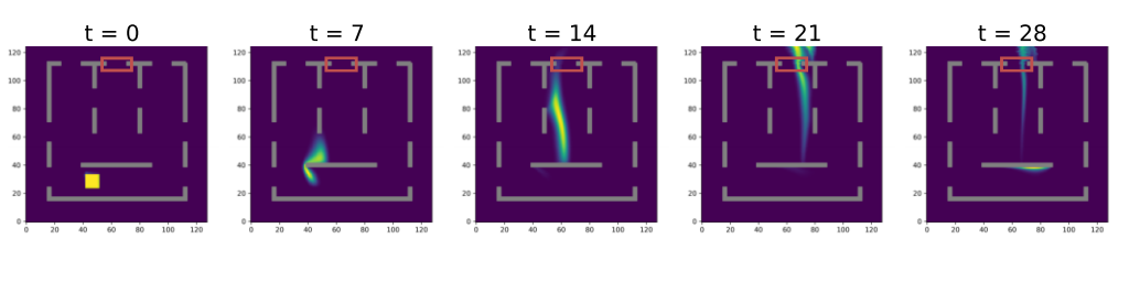 图 9:WDNO 在 2D 不可压缩流体烟雾控制任务的结果(源自 WDNO 论文 Figure 2b)。黄色区域为烟雾,灰色区域为障碍物,顶部中心为目标桶,可见 WDNO 成功引导烟雾绕过障碍物进入目标桶,泄漏率显著降低。