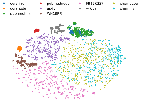 OFA 在 9 个跨领域数据集(涵盖引文网络、分子图、知识图谱)上验证性能。如图 3 所示,OFA-joint-st 模型在不同数据集的 NOI 提示节点输出嵌入空间中,能将不同领域数据清晰分离,证明其对跨域数据的区分能力;在监督学习中,OFA(Llama2-13b)在 Cora 节点分类任务准确率达 77.51%,远超传统 GCN(74.09%);零样本学习中,对未见过的分子属性预测仍能达到 56.92% 准确率,而传统 GNN 完全失效。