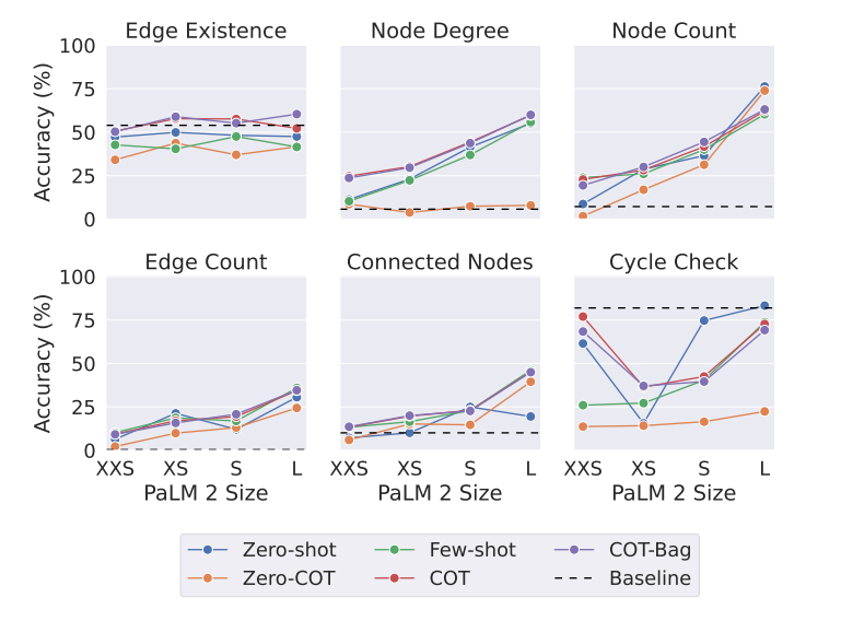 TLG 在 GraphQA 基准(11 种图任务、7 种图结构)上验证性能。如图 6 所示,随着模型容量从 PaLM 2 XXS(约 1B 参数)增至 PaLM 2 L(约 34B 参数),节点度计算准确率从 10.8% 提升至 85.0%,证明大模型容量对图推理的重要性;选择最优 Incident 编码后,节点度计算任务准确率提升 61.8%(从 13.4% 至 75.2%),环检测任务提升 23.2%(从 39.8% 至 63.0%);在混合结构测试集上,TLG 方法准确率比固定编码方法高 14.7%,验证其结构适配能力。
