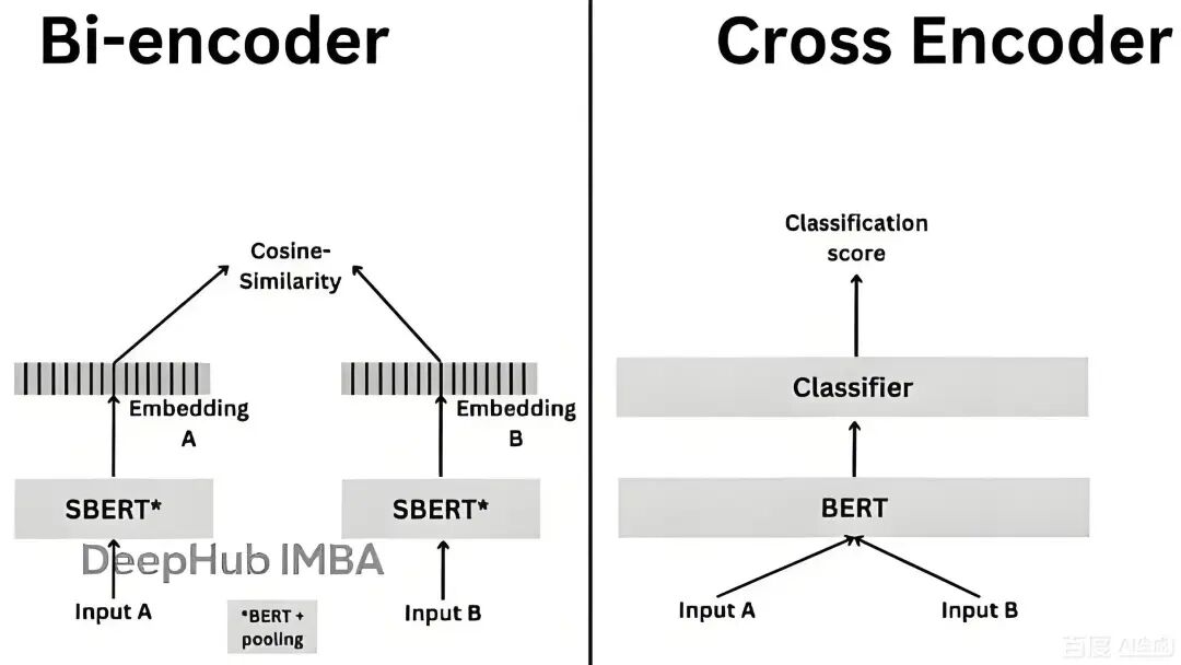 - 左边的 Bi-encoder(双塔编码器) 正是向量检索的核心架构:它会分别将输入 A、B 编码成独立的向量,再通过余弦相似度计算匹配度。