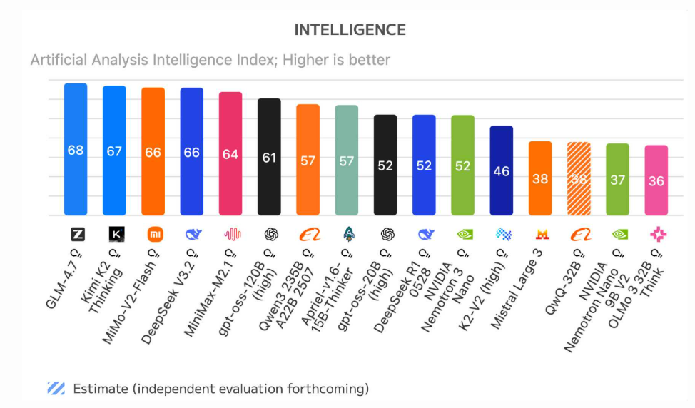 GLM-4.7、Kimi K2 Thinking、MiMo-V2-Flash、DeepSeek V3.2 以及 MiniMax-M2.1 均为中国开源模型。在该榜单中,排名最高的非中国模型是 OpenAI 的 gpt-oss-120B(high),位列第六。