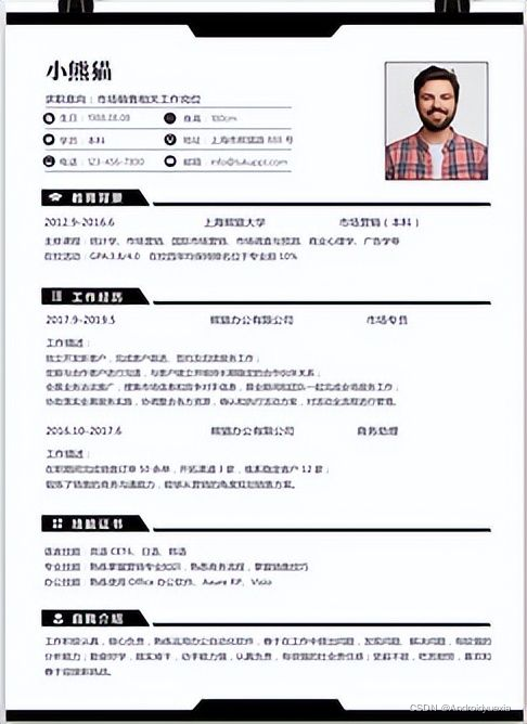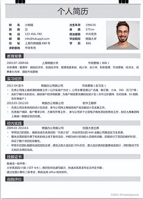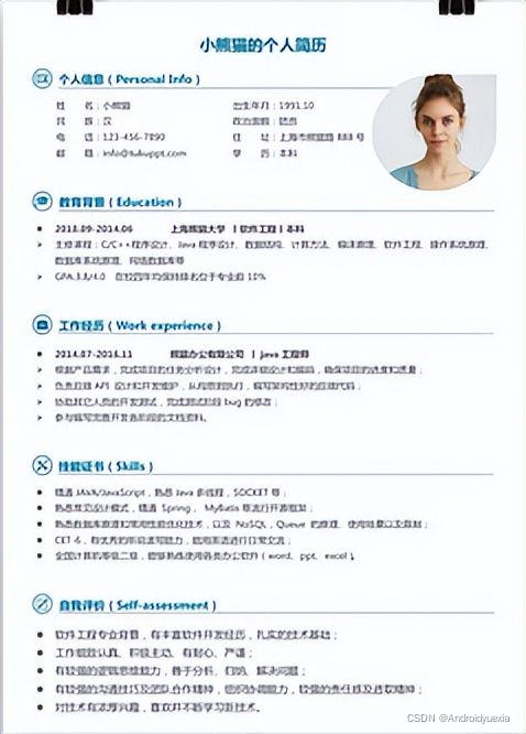 在面试之前,不得不聊聊简历,简历是职场的敲门砖,是拿到offer的通行证,那么对于一个初级测试工程师来说,应该如何写简历呢?可能对于新手来说,完全不知道怎么下手,这里我们从0开始写,首先你必须去找一份简历模板,可以是前程无忧,智联招聘,BOSS等自带的模板,也可以是网络上下载的模块,要求:上下结构,简单即可!不要太花哨!这里取几个栗子,什么样的模板是合适的!如下:(对于照片可有可无,长得Nice和可爱的妹纸除外)
