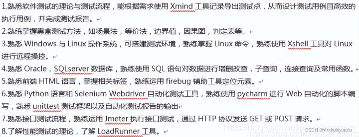 1.个人建议一般要写8条以上,包括数据库,Linux,测试理论,接口测试,自动化测试或性能测试选其一!