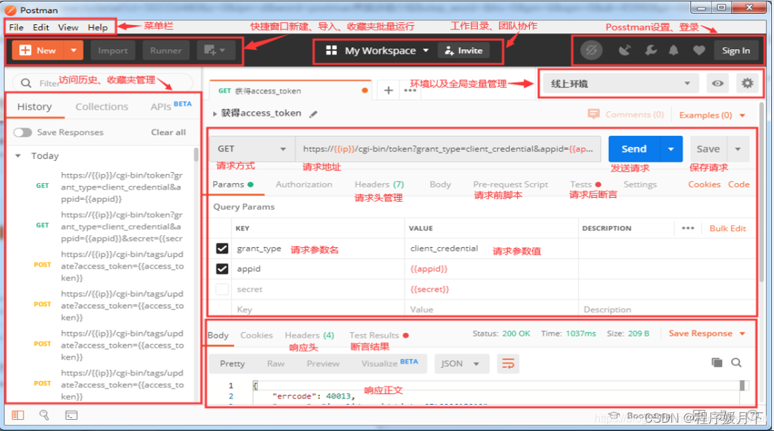 Postman是一款功能强大的网页调试与发送HTTP请求的Chrome插件,专为接口而生。界面功能如下:
