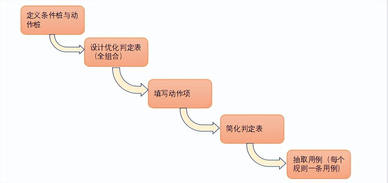 输入条件的组合进行分析。用一个系统的方法选择出高效的测试用例集; 分析思路: 1、分析规格说明描述,确定原因和结果,并赋予标识符; 2、分析规格说明语义,找出原因与原因之间,原因与结果之间关系,画出因果图; 3、有些原因与原因之间,原因与结果之间组合不会出现,用记号表明约束或限制条件; 4、因果图转换为判定表; 5、判定表的每一列作为依据,设计测试用例; 使用场景:必须考虑输入条件的各种组合(一种适合于描述多种条件的组合、相应产生多个动作的形式来进行设计);