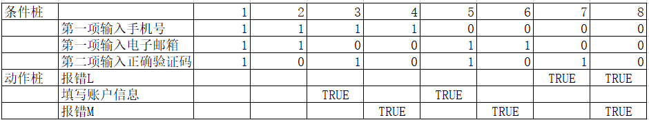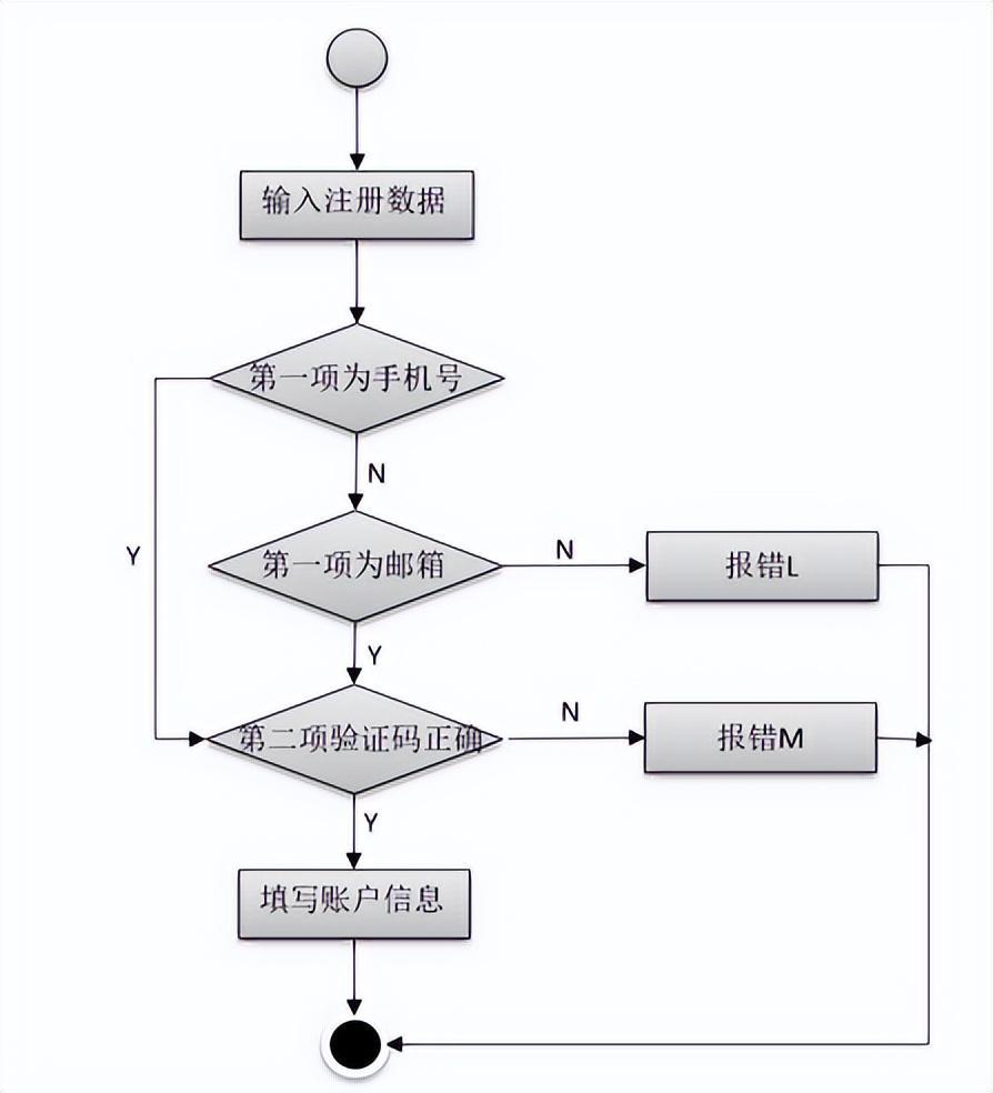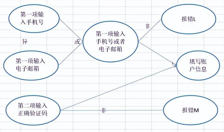 案例:支付宝个人账户注册——验证用户名需求:第一项要求输入手机号或者电子邮箱作为账户名,第二项要求正确输入验证码,两项都验证成功后填写账户信息;但如果第一项校验不正确,则报错L(输入手机号或电子邮箱格式错误);如果第二项验证不成功,则报错M(验证码输入错误)。