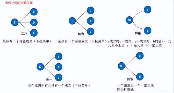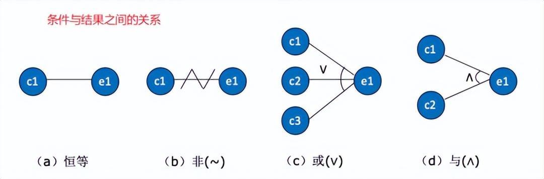判定表法设计用例——规则数:2的n次方(n是条件数) 条件数:4 —> 规则:16 条件数:5 —> 规则:32 条件数:6 —> 规则:64 条件数:7 —> 规则:128 ……… 因果图: 1、考虑所有输入/输出条件的相互制约关系以及组合关系 2、考虑输入条件之间的依赖关系 3、再根据分析的关系来转化为判定表的规则