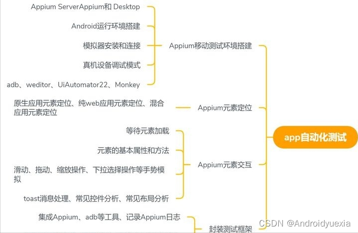 - Appium移动测试环境搭建:Appium ServerAppium和 Desktop、 Android运行环境搭建、模拟器安装和连接、真机设备调试模式、adb、 weditor、 - - UiAutomator22、 Monkey