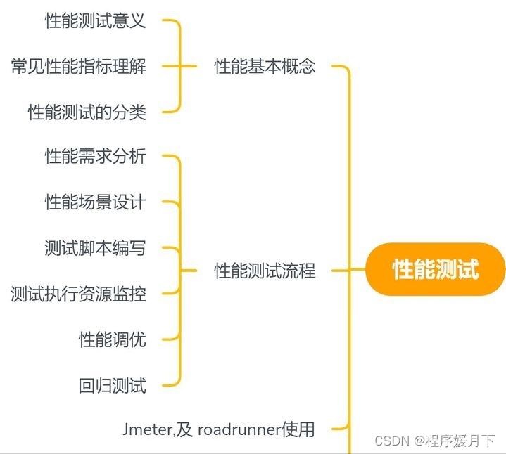 - 性能测试流程:性能需求分析、性能场景设计、测试脚本编写、测试执行资源监控、性能调优、回归测试