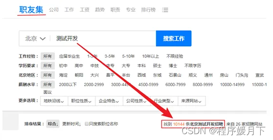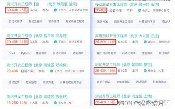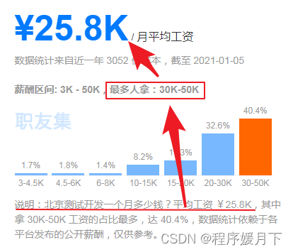 但由于测试开发岗位门槛较高,从业者较少,所以薪资较高。以北京为例,相比测试其他工种在10k,15k左右徘徊,测试开发平均薪资超过25K,如下图所示: